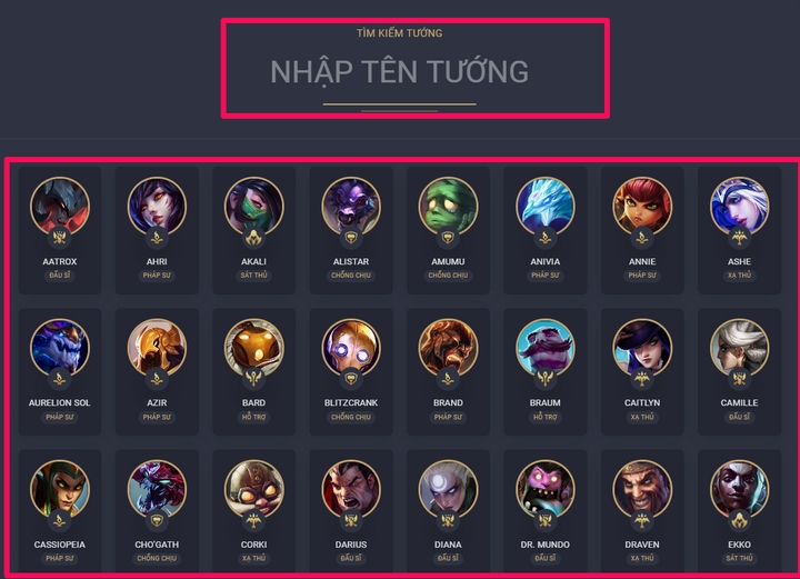 Bạn có thể tra thông tin tướng bằng cách nhập tên tướng hoặc click chọn vào một tướng bất kỳ.