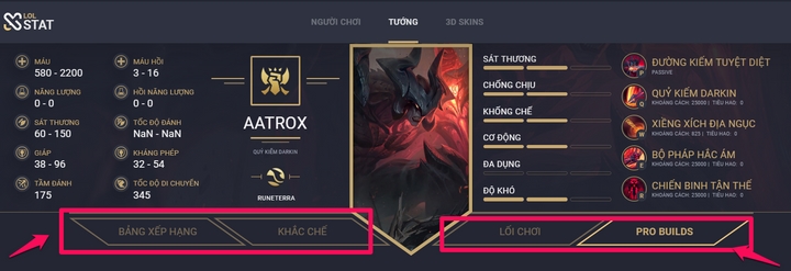 Đặc biệt hơn website còn cung cấp cả thông tin giúp bạn làm sao để khắc chế tướng đó và nhiều chứ năng khác nữa bằng cách lick vào các tab “khắc chế”, “lối chơi”, “Pro Builds”
