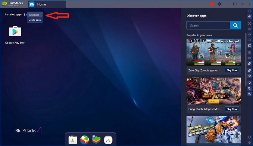 - Bước 3: Sau khi cài đặt phần mềm Bluestacks và khởi chạy phần mềm các bạn chọn Installed apps chọn tiếp Install apk