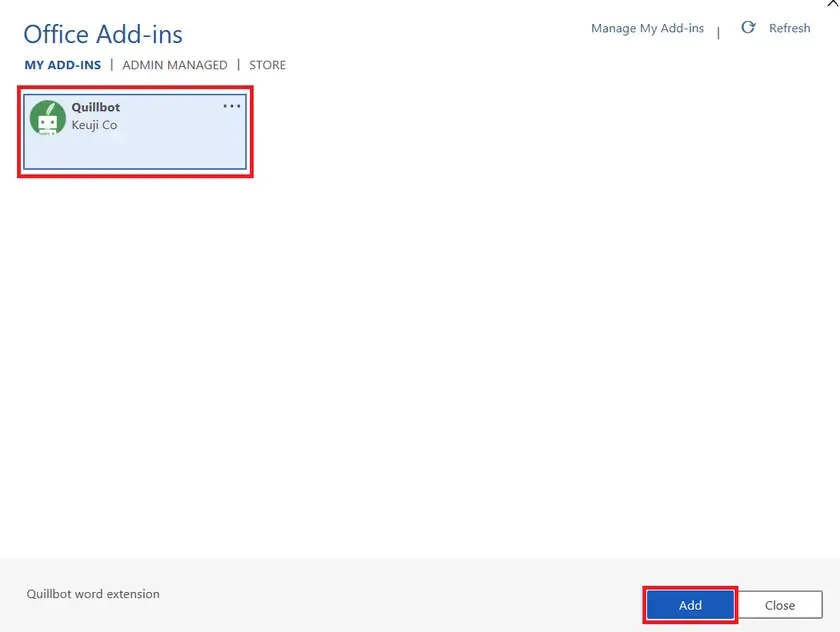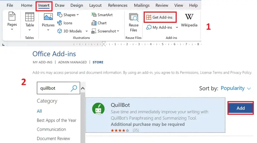 - Bước 4: Sau đó, bạn hãy quay lại mục “Insert” > “My Add-ins” > cuối cùng chọn “Quillbot” > cuối cùng chọn “Add”.