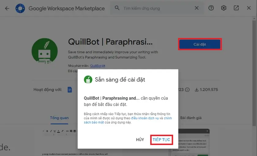 - Bước 2: Tìm kiếm Quillbot > Chọn “Cài đặt” > Nhấn “Tiếp tục” để cấp quyền thêm Quillbot vào Google Docs.