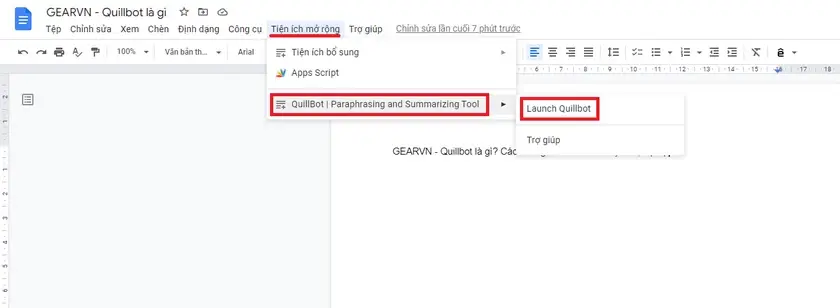 - Bước 3: Để sử dụng tiện ích Quillbot trên ứng dụng Google Docs, lần lượt chọn “Tiện ích mở rộng” > “Quillbot | Paraphrasing and Summarizing Tool” > cuối cùng chọn “Launch Quillbot”.