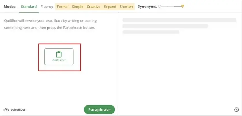 Bước 4: Sau khi đã tải lên phần văn bản cần chuyển đổi, bạn tiến hành chọn chế độ chuyển đổi ở phía trên cùng của hộp thoại văn bản bên góc trái. Có tổng cộng 7 chế độ (Fluency, Creative, Creative+, Formal, Shorten, Expand) và chế độ mặc định luôn là Standard.