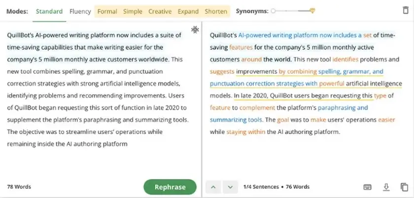 - Viết lại câu: QuillBot có thể viết lại câu theo nhiều phong cách khác nhau, bao gồm cả chính thức, không chính thức, sáng tạo, thú vị…