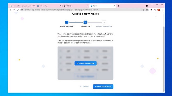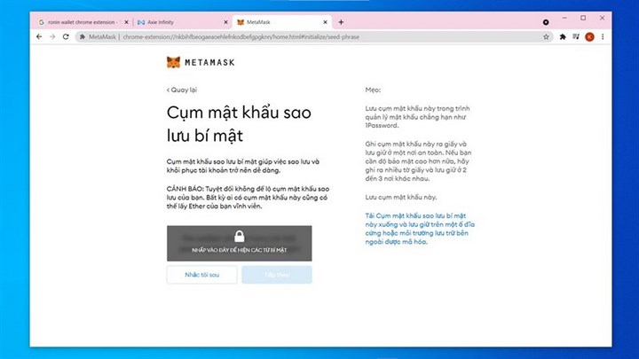 - Bước 4: Nhập mật khẩu sau đó bạn sẽ nhận được dãy số bí mật tương tự như khi tạo ví ví Ronin hãy lưu chúng lại để còn dùng ở bước sau.