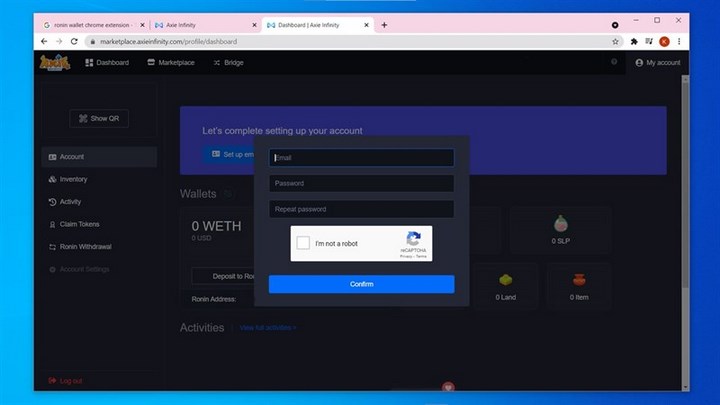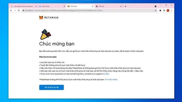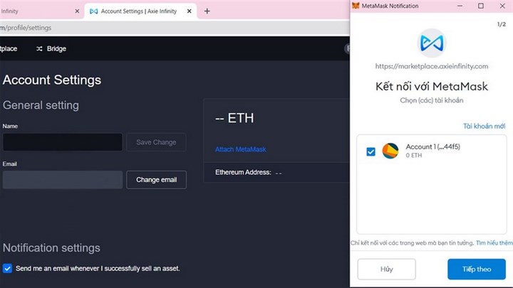 Sau khi hoàn tất các bước tạo ví ví Ronin và ví Metamask chúng ta sẽ kết nối chúng lại với nhau và với Axie Infinity Game như sau .