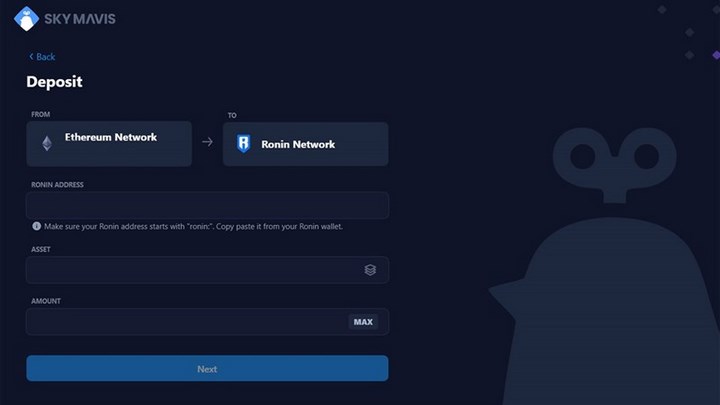 - Bước 1: Chọn Account > chọn Deposit to Ronin (nạp tiền vào ví Ronin) hoặc Withdraw from Ronin (Rút tiền ra khỏi ví)