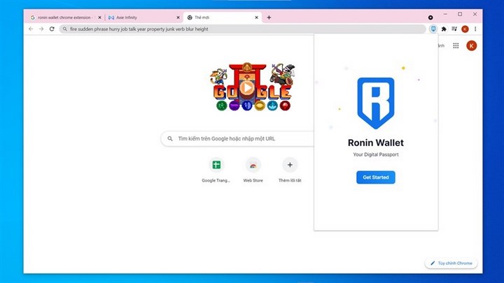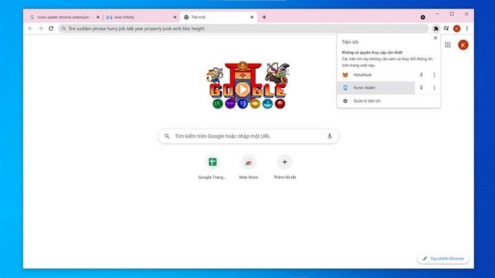 - Bước 2: Sau khi cài đặt xong các bạn vào mục tiện ích trên thanh công cụ của Google Chrome > Chọn Ronin Wallet