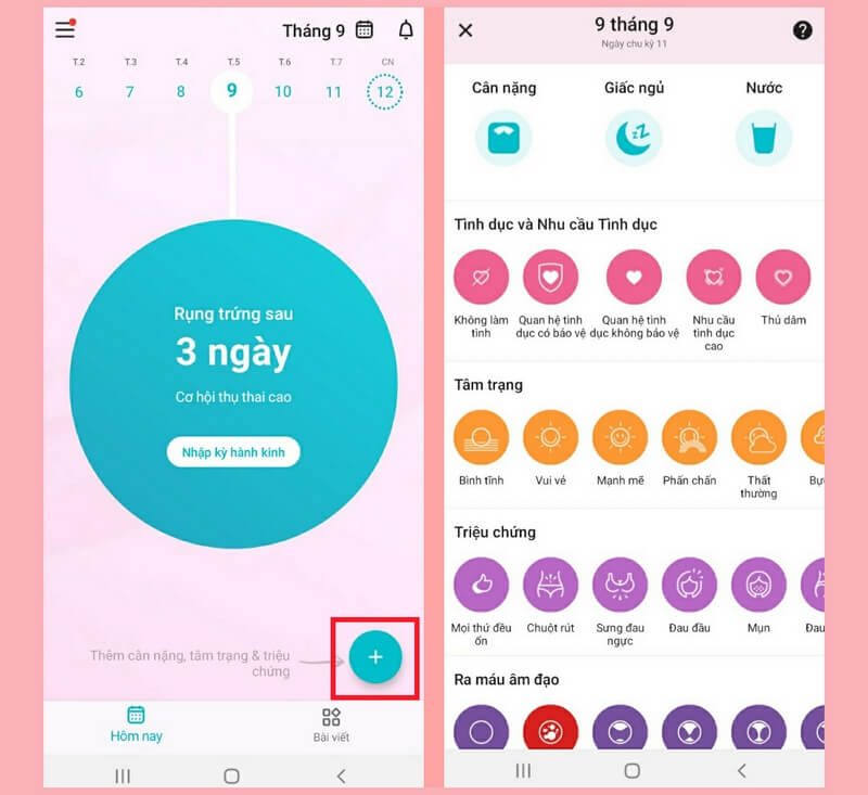 - Bước 8 : Bạn bấm chọn hình dấu cộng để có thể thêm tình trạng, cân nặng của mình theo từng ngày.