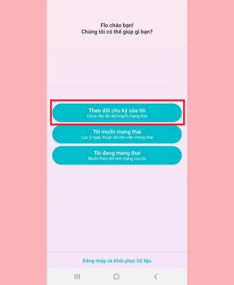 - Bước 3 : Tùy theo nhu cầu của bạn sử dụng ứng dụng Flo để lựa chọn phù hợp, như hình bên dưới chọn “Theo dõi chu kỳ của tôi”.