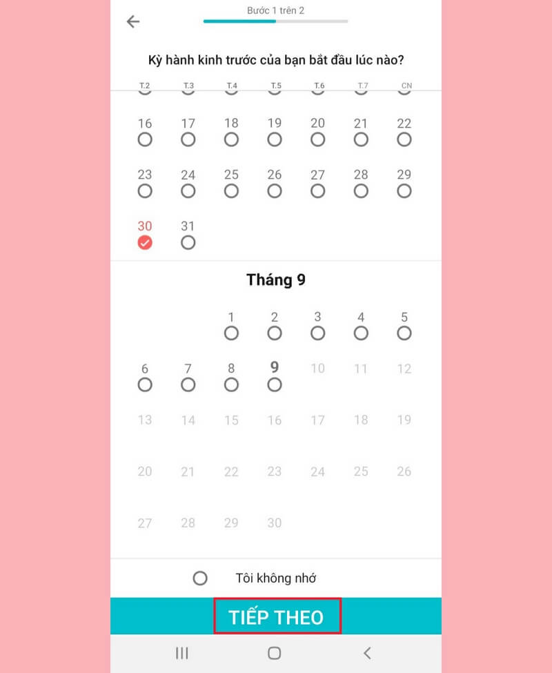- Bước 4 : Bạn nhập kỳ hành kinh trước của bạn, nếu không nhớ bạn có thể chọn “Tôi không nhớ”. Sau đó, bạn chọn “Tiếp theo”