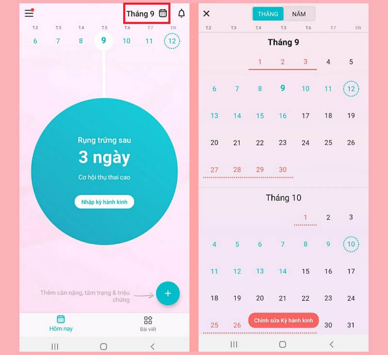 - Bước 7 : Để xem kỳ hành kinh của mình, bạn chọn vào biểu tượng lịch ở góc trên bên phải.