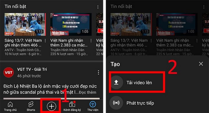 - Bước 1: Mở ứng dụng YouTube trên điện thoại, nhấn vào biểu tượng dấu cộng icon dấu cộng và chọn mục Tải video lên.