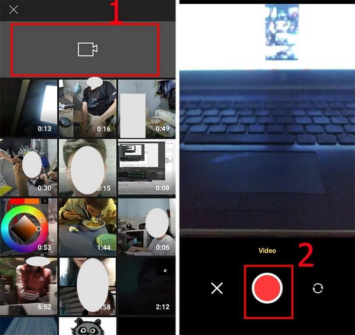 - Bước 2: Nhấn vào biểu tượng máy quay icon máy quay rồi nhấn vào nút tròn đỏ nút tròn đỏ để quay video ngắn. Ngoài ra bạn có thể chọn video có sẵn trong thư viện trên điện thoại.