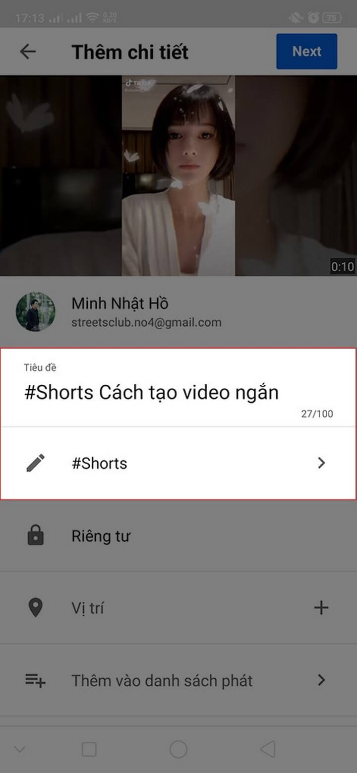 - Bước 3: Để tạo video Shorts YouTube, thì trong phần tiêu đề hoặc mô tả bạn phải gắn hashtag #Shorts. Sau đó nhấn Tiếp theo (Next).