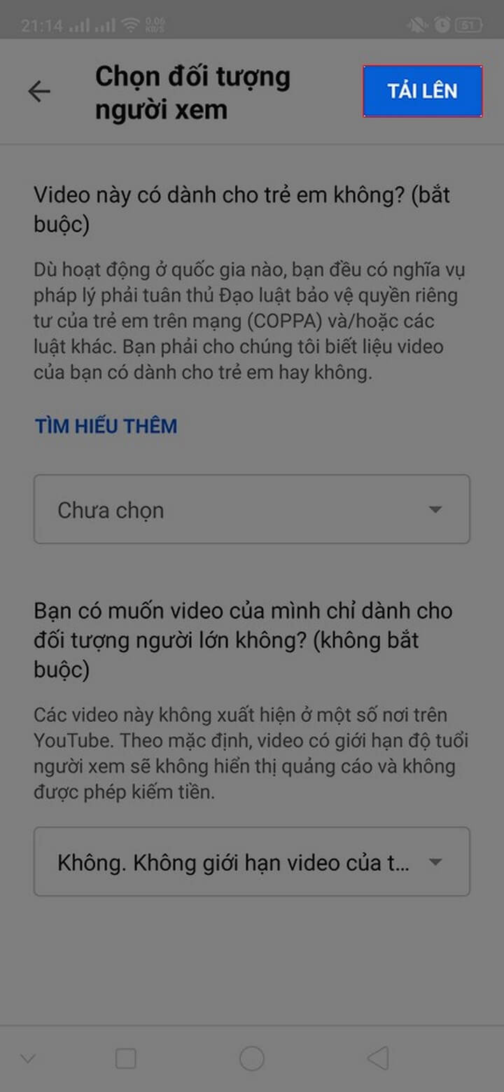 - Bước 4: Thiết lập tùy chọn video có nội dung dành cho trẻ em hay không và nhấn Tải lên để hoàn tất tạo video Shorts YouTube.